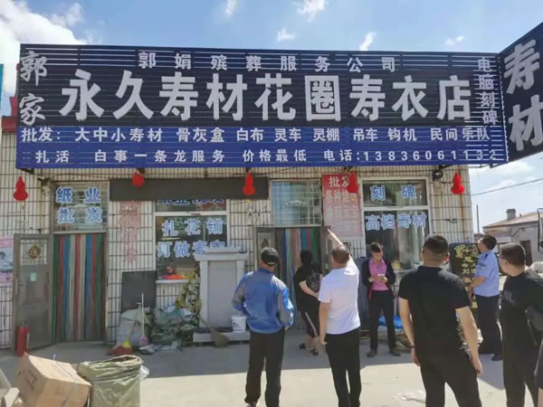 6月22日,肇東市民政局會同肇東市市場監(jiān)督管理局以及公安局等部門執(zhí)法人員對昌五鎮(zhèn)三家殯葬用品經(jīng)營業(yè)戶進行監(jiān)督檢查。檢查中,民政局對未獲取殯葬用品生產(chǎn)經(jīng)營許可證的經(jīng)營業(yè)戶下達了辦證告知書。