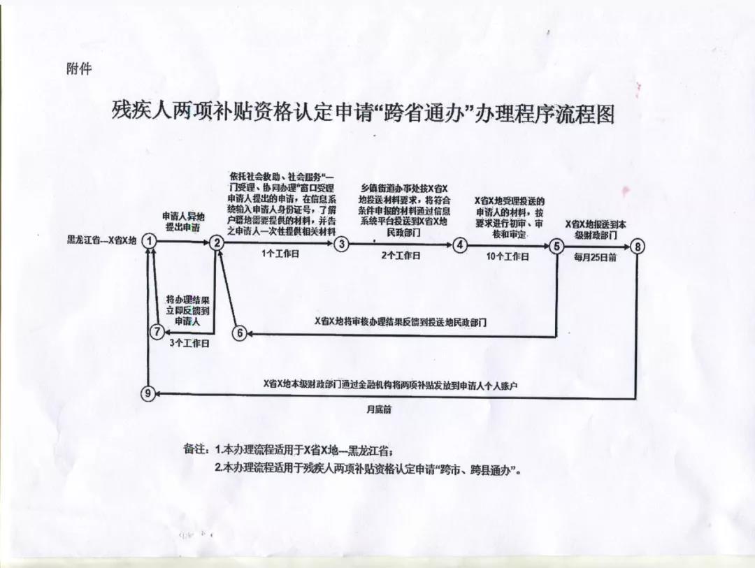 二、規(guī)范補(bǔ)貼資格認(rèn)定申請(qǐng)“跨省通辦”程序各鄉(xiāng)(鎮(zhèn))、街道辦事處要按照異地代收代辦方式,統(tǒng)一使用全國殘疾人兩項(xiàng)補(bǔ)貼信息系統(tǒng)(以下簡(jiǎn)稱全國系統(tǒng))受理殘疾人兩項(xiàng)補(bǔ)貼資格認(rèn)定“跨省通辦”申請(qǐng)。受理地要一次性告知申請(qǐng)人所需要提供的材料,及時(shí)將相關(guān)證明材料等申請(qǐng)信息錄入全國系統(tǒng),并在申請(qǐng)材料收齊之日起3個(gè)工作日內(nèi)推送至業(yè)務(wù)屬地(即申請(qǐng)人戶籍所在地)的補(bǔ)貼受理窗口;業(yè)務(wù)屬地為申請(qǐng)人遠(yuǎn)程辦理,自收到推送材料之日起10個(gè)工作日內(nèi)完成補(bǔ)貼資格認(rèn)定,辦理結(jié)果將由全國系統(tǒng)實(shí)時(shí)反饋受理地;受理地應(yīng)在收到辦理結(jié)果3個(gè)工作日內(nèi),將辦理結(jié)果以適當(dāng)方式通知申請(qǐng)人。享受補(bǔ)貼政策的類型及標(biāo)準(zhǔn)由業(yè)務(wù)屬地負(fù)責(zé)解釋。補(bǔ)貼資格審定合格的,自遞交申請(qǐng)當(dāng)月由業(yè)務(wù)屬地計(jì)發(fā)補(bǔ)貼。
