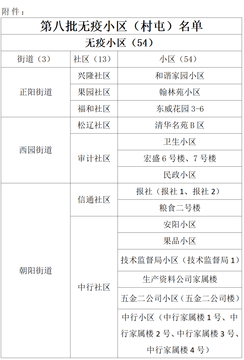 第八批確定無(wú)疫小區(qū)(村屯)共62個(gè),其中54個(gè)無(wú)疫小區(qū)、7個(gè)準(zhǔn)無(wú)疫小區(qū)、1個(gè)無(wú)疫村。