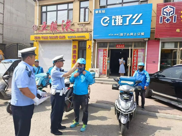 在“餓了么”外賣企業(yè),民警首先同企業(yè)負(fù)責(zé)人進(jìn)行了深入詳談,要求企業(yè)加強(qiáng)對(duì)員工的交通安全教育,時(shí)刻繃緊安全神經(jīng),把交通安全放在工作首位。要求騎手出行必須正確佩戴合格頭盔,最大限度降低交通安全風(fēng)險(xiǎn);貨車出行司乘人員要正確系好安全帶,嚴(yán)格遵守交通規(guī)則。之后民警向企業(yè)員工們宣講了“一盔一帶”等交通安全知識(shí),檢查了騎手佩戴安全頭盔情況,發(fā)放宣傳單、手冊(cè)等宣傳資料,并為騎手現(xiàn)場(chǎng)講解了正確佩戴頭盔的重要性和必要性。