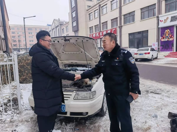 近日,肇東市公安局警格員(交警大隊(duì)民警張曉偉)及時(shí)幫助群眾對(duì)電打火啟動(dòng)車輛,獲得社區(qū)群眾高度贊揚(yáng)。