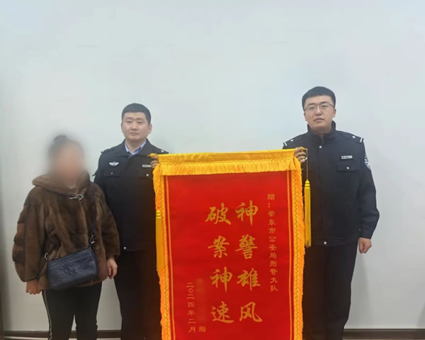 在“春雷行動”中,肇東市公安局刑警大隊緊盯重案、要案,采取快偵、速破原則,成功偵破一起持刀搶劫案手機案,贏得了轄區(qū)居民的一致好評。2月18日,肇東市居民劉女士,將一面印有“神警雄風(fēng) 破案神速”的錦旗,送到肇東市公安局刑警大隊民警手中,以表感激之情。