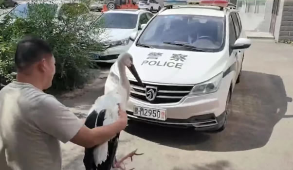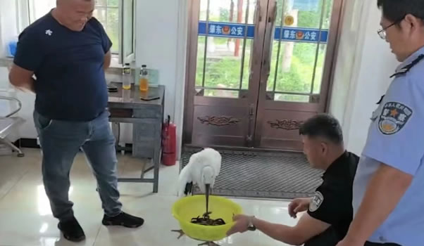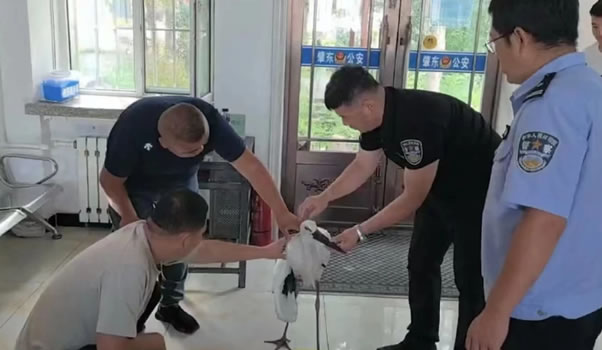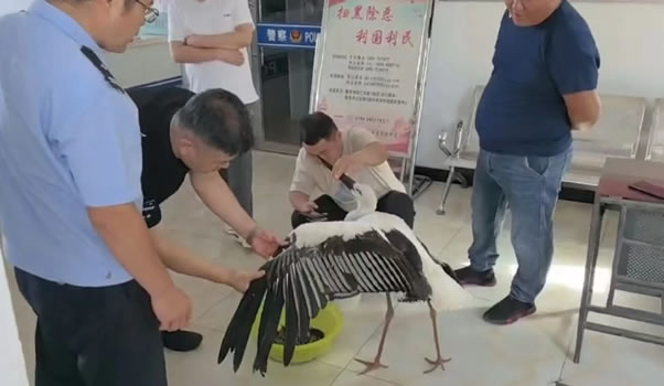 8月28日,躍進(jìn)鄉(xiāng)福龍村書記宋健來(lái)到肇東市公安局躍進(jìn)派出所,稱在躍進(jìn)鄉(xiāng)福龍村新發(fā)屯草甸子上發(fā)現(xiàn)一只大鳥晃晃蕩蕩落在草甸子上,不斷哀鳴。大鳥體長(zhǎng)120厘米左右,身上大部分呈白色,翅膀下方呈黑色,嘴部呈黑色,嘴的基部較厚,往尖端逐漸變細(xì),并且略微向上翹,前頸的下部有呈披針形的長(zhǎng)羽,腿部較長(zhǎng)。但他一下子想不起來(lái)鳥的名字,只是知道它應(yīng)該是保護(hù)動(dòng)物,因此請(qǐng)求派出所進(jìn)行救助。宋健介紹不知為什么,發(fā)現(xiàn)時(shí)這只大鳥不飛、不動(dòng),行動(dòng)遲緩,也不曾進(jìn)食,走上前也不怕,站在原地,他趕緊將它抱到派出所。民警看到大鳥后宛如“仙鶴”下凡,優(yōu)美的體態(tài),潔白的羽毛,朱紅色的眼眶,寬而長(zhǎng)的翅膀,一看就是不尋常的鳥,民警擔(dān)心它有傷或是生病了,立即聯(lián)系肇東市林業(yè)部門,尋求專業(yè)的指導(dǎo);經(jīng)專家仔細(xì)辨認(rèn),這只鳥類并不是“仙鶴”,而是被譽(yù)為“鳥中大熊貓”的東方白鸛,是國(guó)家一級(jí)保護(hù)動(dòng)物。經(jīng)初步檢查,其外表沒(méi)有明顯傷痕,右側(cè)翅膀受點(diǎn)輕傷耷拉下來(lái),但整體狀態(tài)較為虛弱,民警在派出所設(shè)置臨時(shí)保護(hù)區(qū)域,確保動(dòng)物的安全,避免其受到二次傷害,民警拿來(lái)小魚和水進(jìn)行投喂,白鸛簡(jiǎn)單吃了幾只小魚。隨后民警對(duì)村書記的救助行為表示感謝。